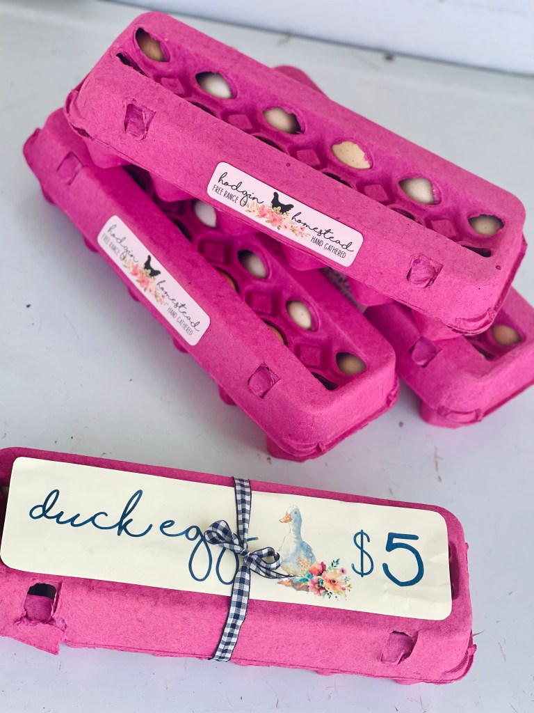 I really need to order different cartons entirely for the duck eggs, since they’re so much bigger and cause the chicken egg cartons to tear. I always end up having to tie twine or ribbon around them to keep them shut.