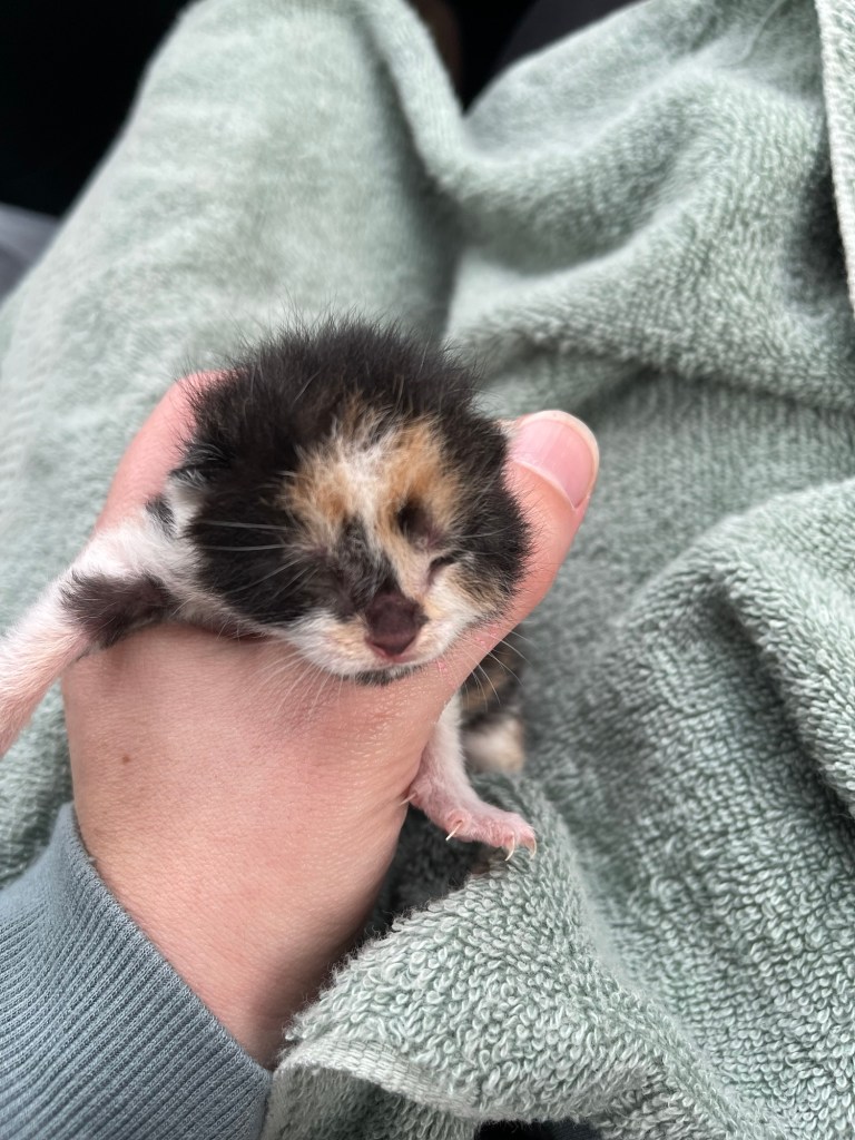 A beautiful little calico. Eyes still shut. By her size I was guessing she was about a week old, and in surprisingly good health. We ran to the store for KMR, but I had everything else on hand. You never know when you’ll find an orphaned critter!